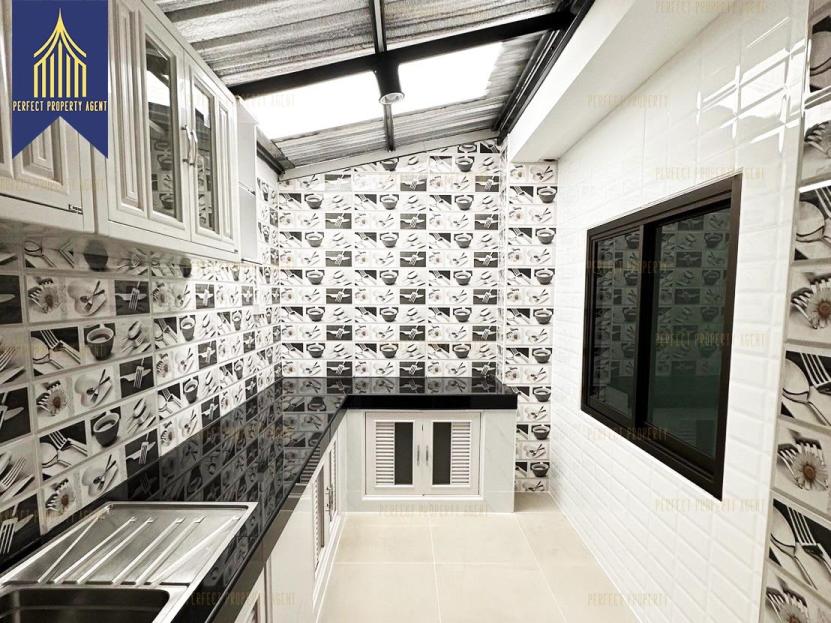 | บ้านทาวน์เฮ้าส์ ต่อเติมให้พร้อมอยู่ ครัวเคาเตอร์ซิ้งค์อ่างล้างจาน ต่อเติมโรงจอดรถปูกระเบื้องสวยงามเรียนร้อย ออกบางนาตราดหรือศรีนครินทร์ กิ่งแก้วบางพลีก็สะดวก สบาย |